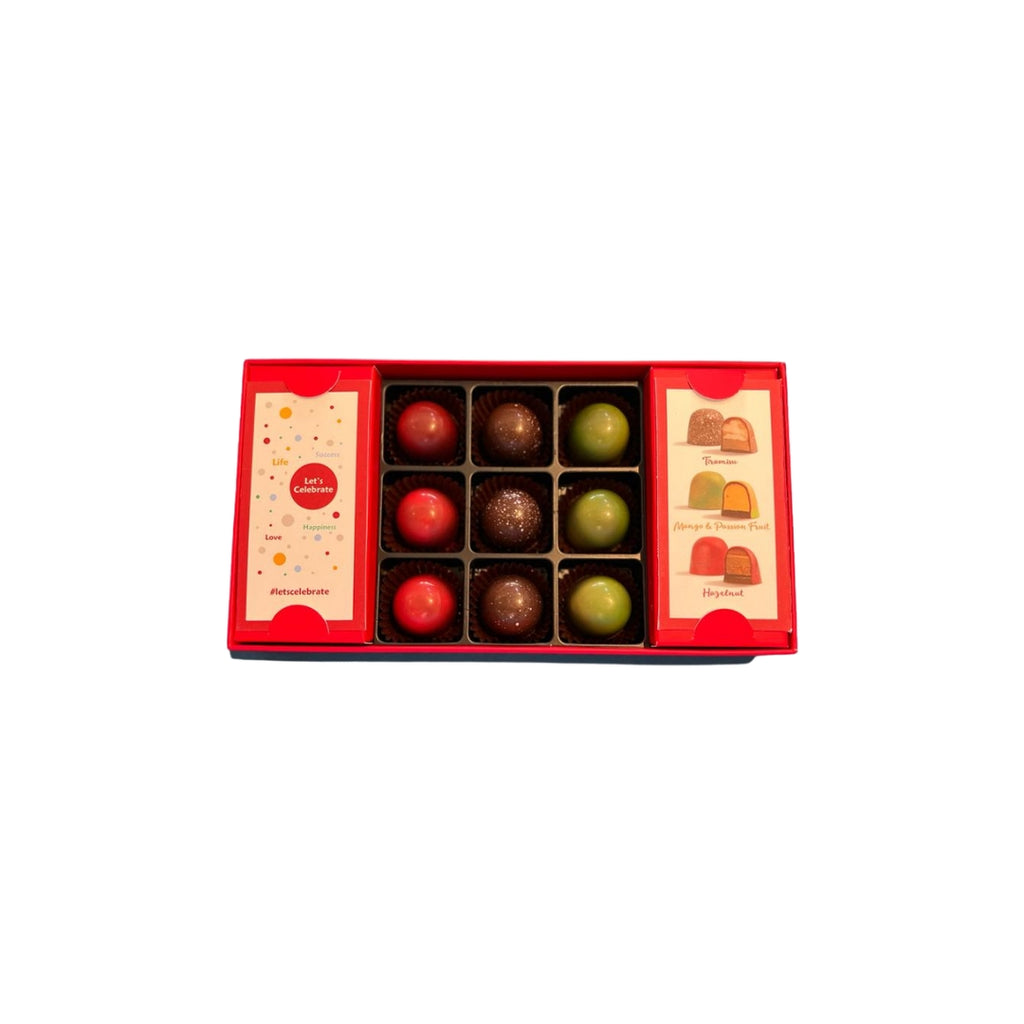 Small Fine Chocolate Box contains 9 pieces of delectable chocolates with natural flavor fillings: Tiramisu, Hazelnut, Mango & Passionfruit.